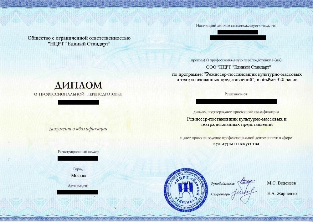 • «Режиссер-постановщик культурно-массовых и театрализованных представлений» с правом ведения профессиональной деятельности в сфере культуры и искусства